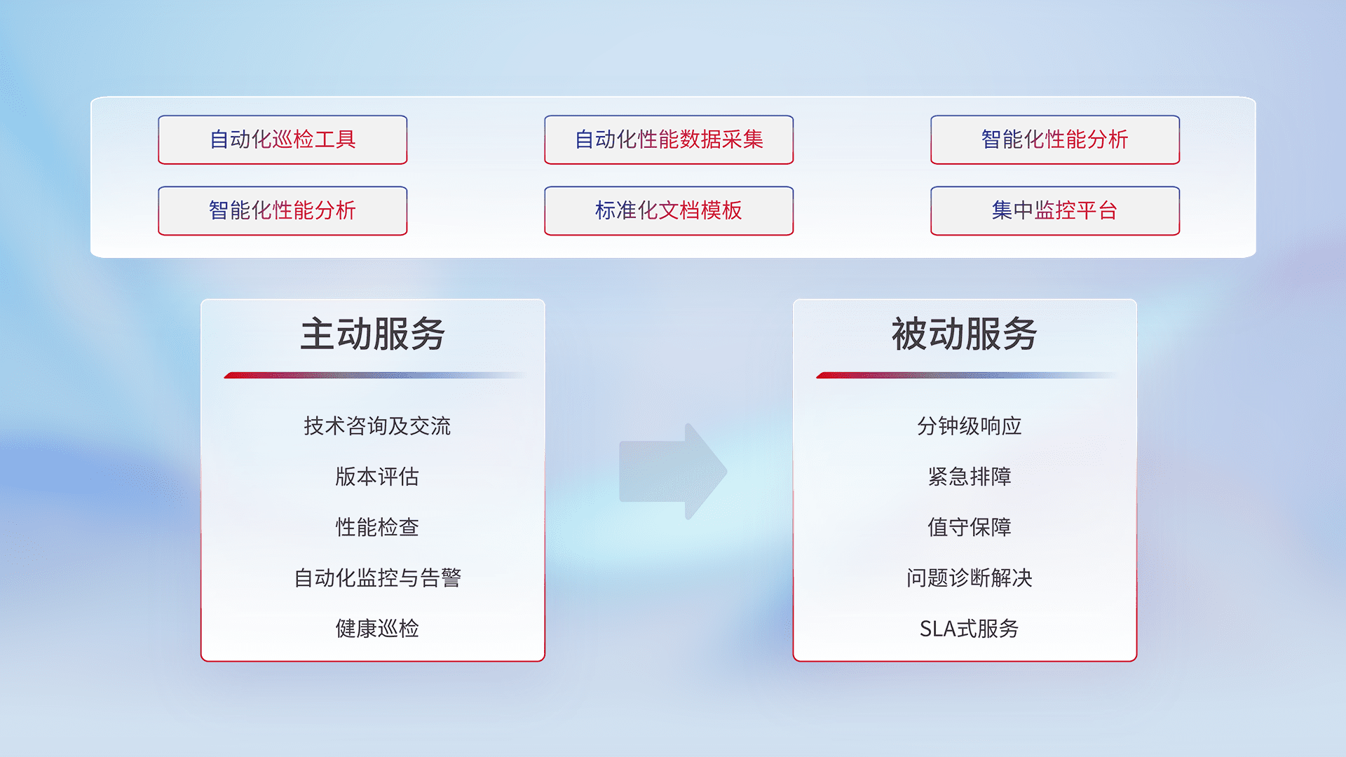 智能化工具和标准化文档,,,保障服务质量,,提供主动服务(包含技术咨询、、、版本评估、、、性能检查、、、、自动化监控与告警、、、、健康巡检)和被动服务包含(分钟级响应、、、、紧急排障、、值守保障、、问题诊断解决、、、、SLA服务)。。