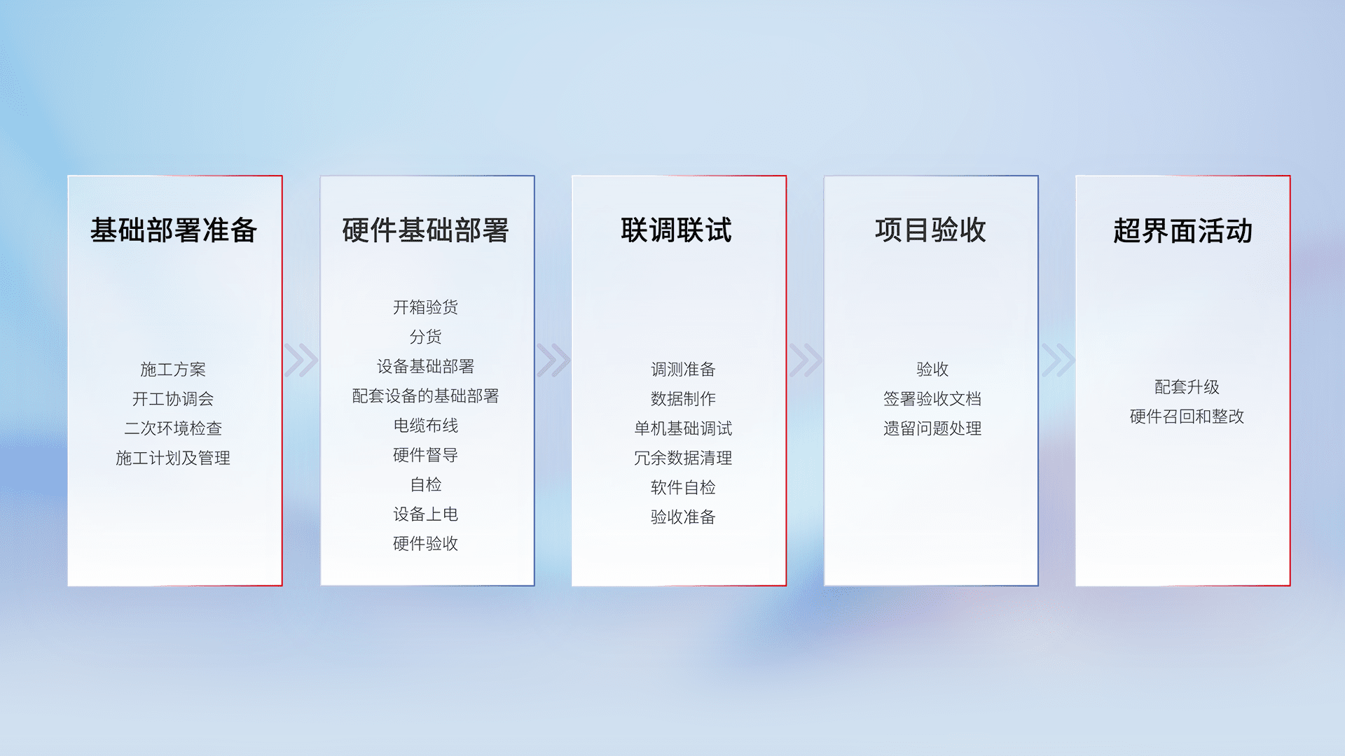从基础部署准备、、、硬件基础部署、、联调联试、、项目验收、、、越界面活动的全过程可追溯,,保证施工质量和进度。。